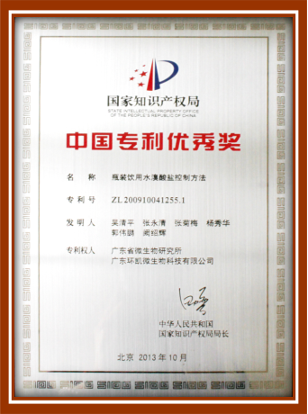中国专利优秀奖“瓶装饮用水溴酸盐控制方法”;