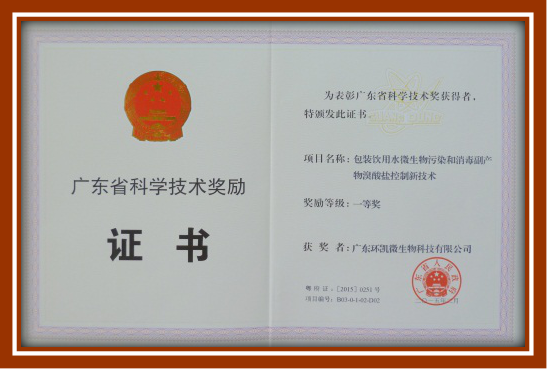 广东省科学技术一等奖“包装饮用水微生物污染和消毒副产物溴酸盐控制新技术”;