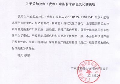 我司生产的孟加拉红(虎红)琼脂从2018.01.24(1071041批次)起粉末颜色为淡黄色,与之前批次(粉红色)相比发生了变化,主要原因是孟加拉红原料更换生产厂家所致。经验证,原料厂家的更换,只是使培养基的粉末色泽发生了变化,平板配置后颜色仍与旧批次平板颜色一致,不会影响该培养基的检测性能。因此,将用新厂家原料生产的孟加拉红(虎红)琼脂的粉末颜色标准变更为淡黄色。