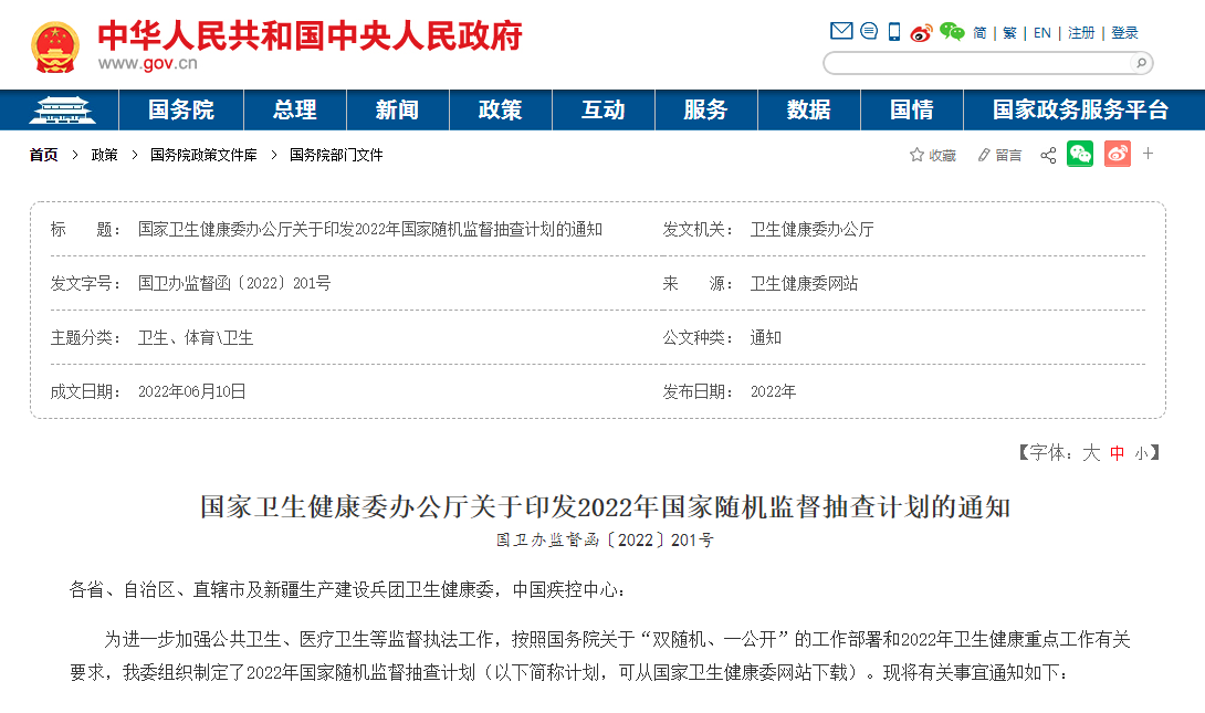 国家卫生健康委办公厅关于印发2022年国家随机监督抽查计划的通知