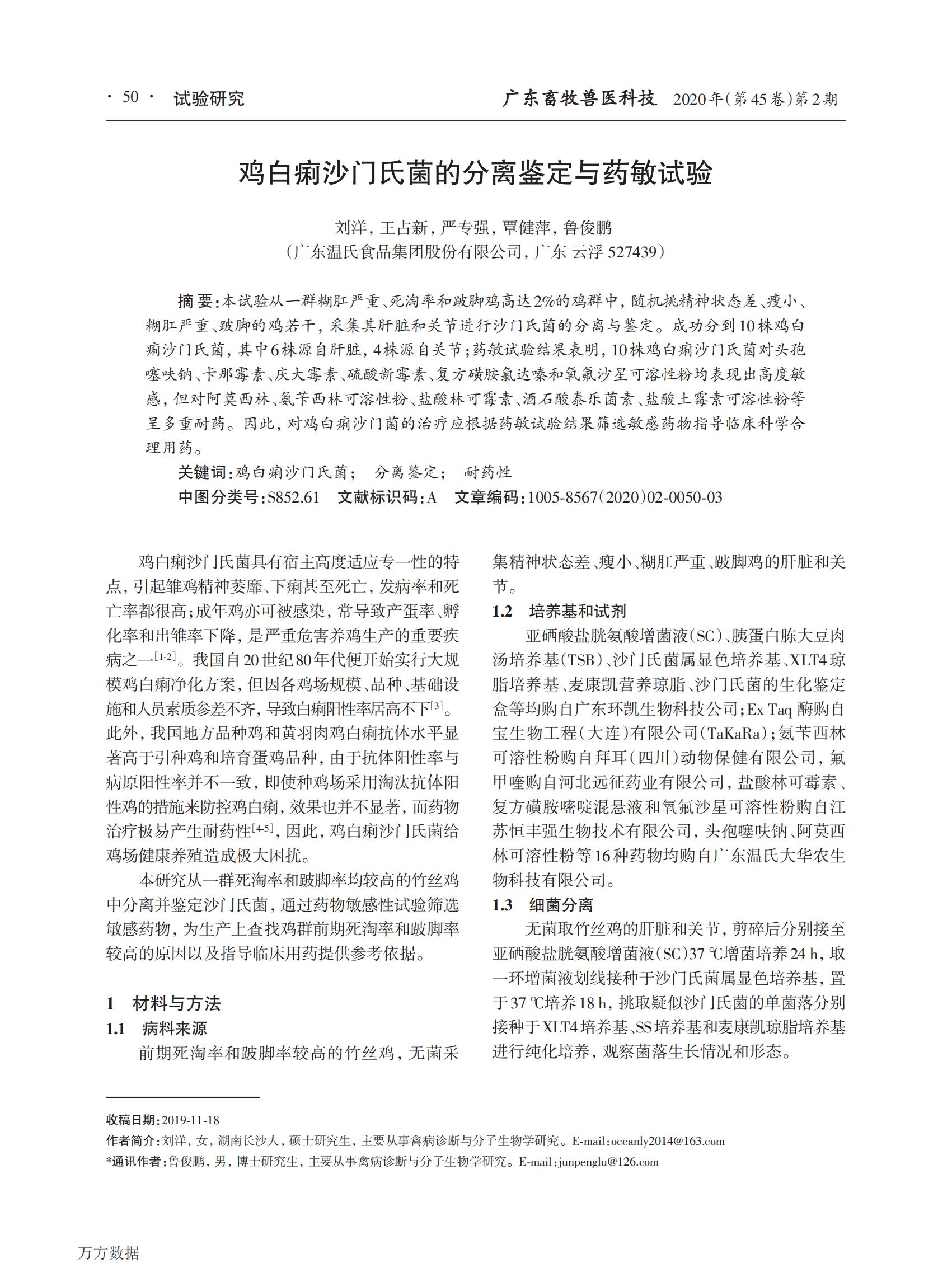 鸡白痢沙门氏菌的分离鉴定与药敏试验