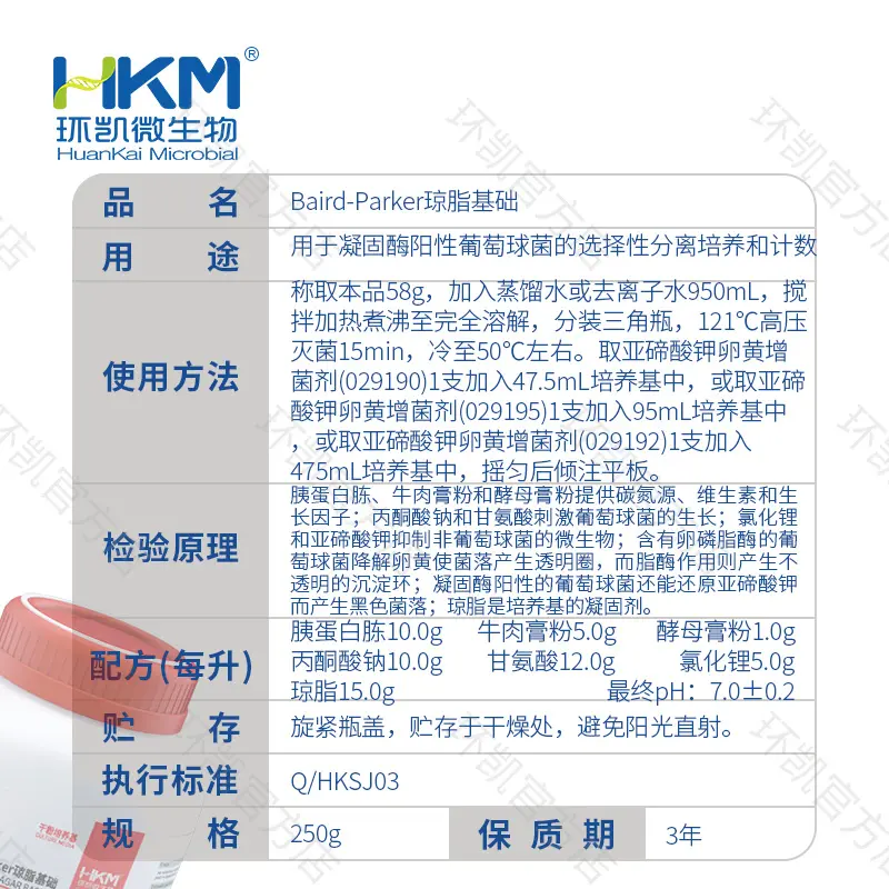 | Baird-Parker琼脂基础颗粒 | 024040P1 | 颗粒 | 250g/瓶 | 用于凝固酶阳性葡萄球菌的选择性分离培养和计数。 |