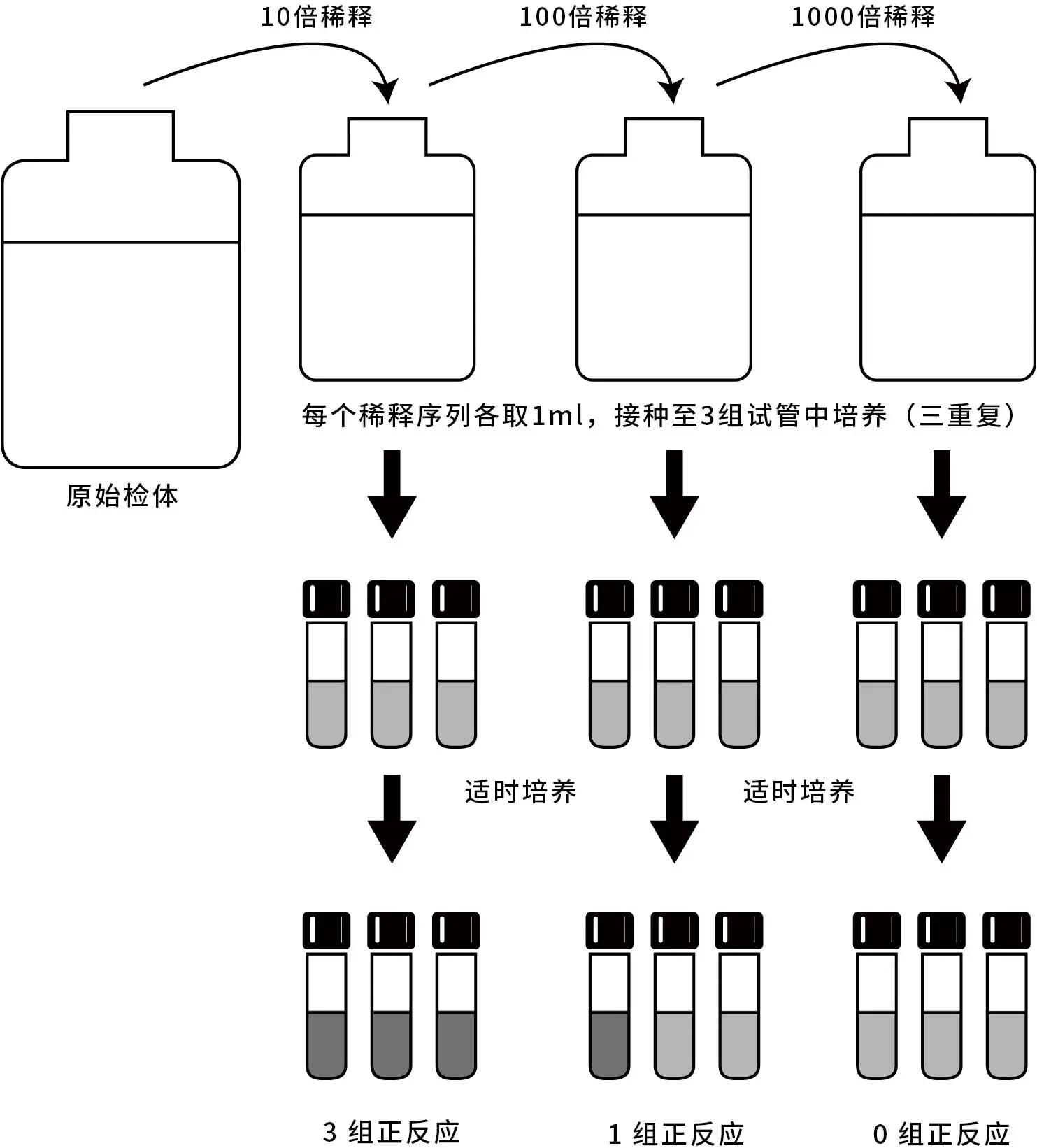 相较于 CFU 方法直接计算培养出来的真实菌落数,MPN 法必须将样品备制成 3 个连续 10 倍稀释的系列稀释液,每稀释系列进行 3 次重复的液体培养基的接种培养(注一),即所谓的“三阶 3 支”稀释培养法,通过培养后观察到的微生物生长正反应数目,去比对 MPN 表(最大可能数表)查出该微生物最大机率的可能数目,最终检验结果以样品的每单位重量或容量所含 MPN 数,即以 MPN/g 或 MPN/mL 为单位表示之。