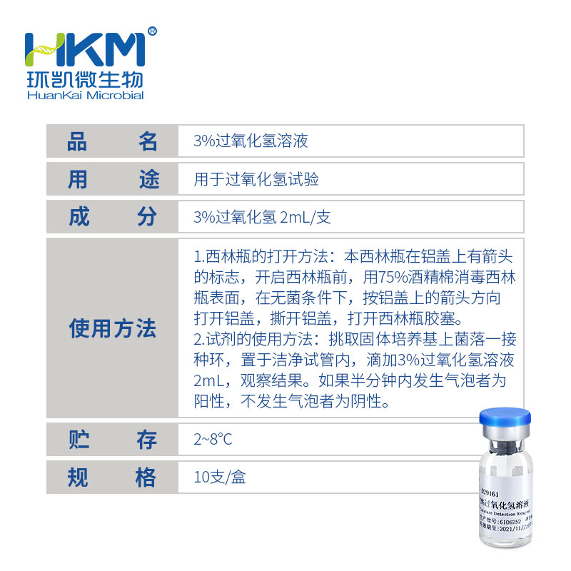 使用方法:挑取固体培养基上菌落一接种环,置于洁净玻片上,滴加3%过氧化氢溶液数滴,观察结果。如果半分钟内发生气泡者为阳性,不发生气泡者为阴性。