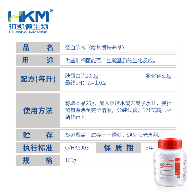 022110 蛋白胨水(靛基质培养基) 100g/瓶 相关产品(生化鉴定检验检测常用培养基):