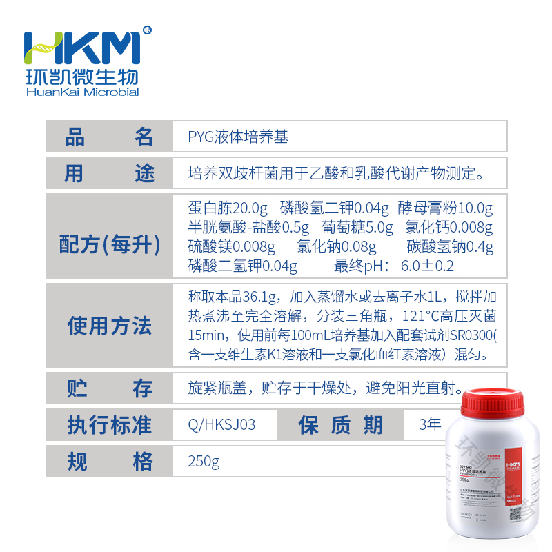 PYG液体培养基检验原理:蛋白胨、酵母粉提供氮源、维生素和生长因子;葡萄糖为可发酵糖类;半胱氨酸-盐酸、维生素K1、氯化血红素、硫酸镁、氯化钙、氯化钠、碳酸氢钠为培养各种双歧杆菌提供生长因子;磷酸氢二钾、磷酸二氢钾为缓冲剂。