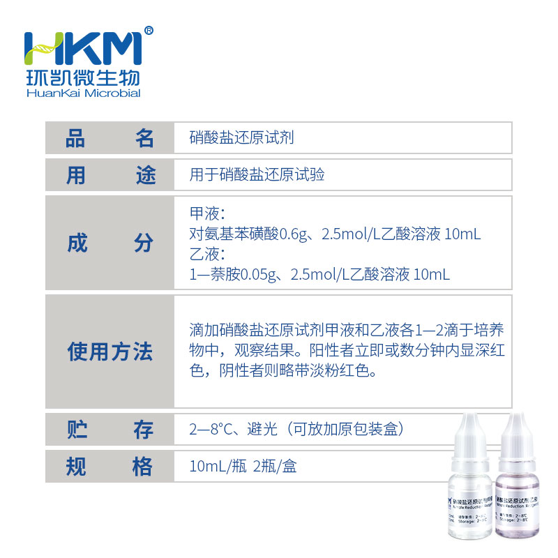 使用方法:滴加硝酸盐还原试剂甲液和乙液各1-2滴于培养物中, 阳性者于立刻或数分钟内显深红色,阴性者则略带淡粉红色。