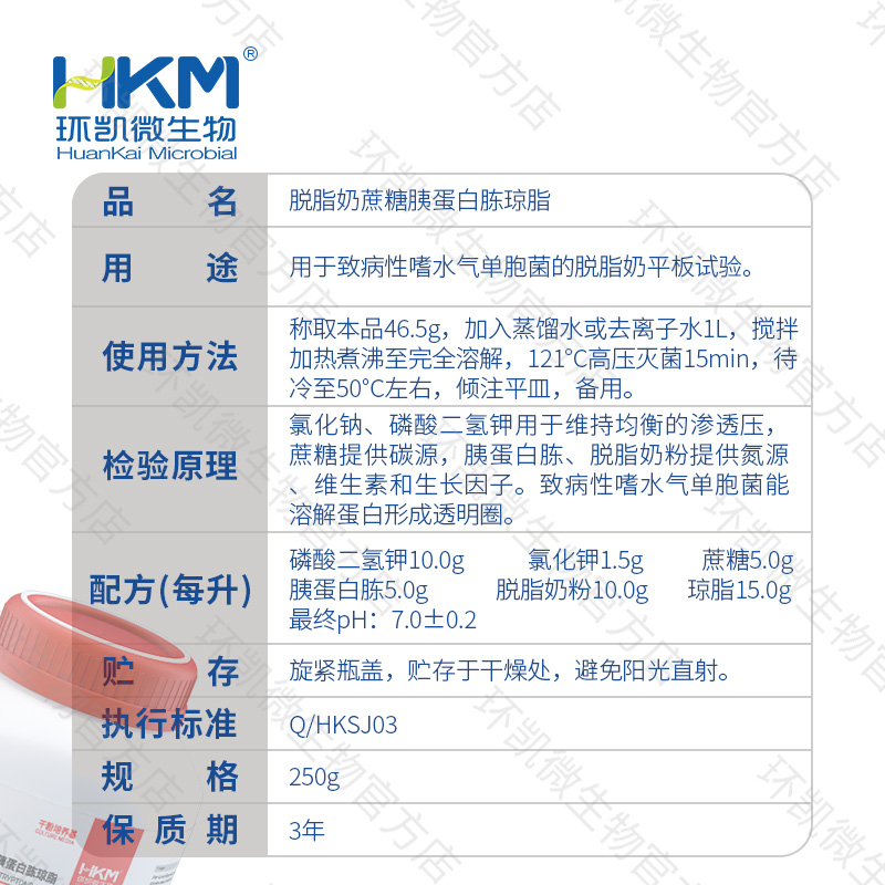 脱脂奶蔗糖胰蛋白胨琼脂检验原理:氯化钠、磷酸二氢钾用于维持均衡的渗透压,蔗糖提供碳源,胰蛋白胨、脱脂奶粉提供氮源、维生素和生长因子。致病性嗜水气单胞菌能溶解蛋白形成透明圈。
