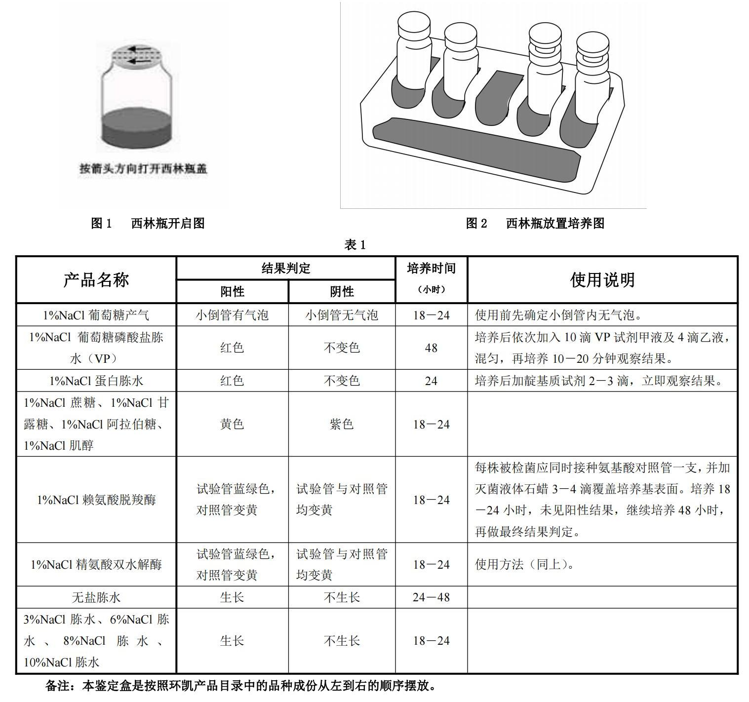 挑取平板分离的可疑菌落进行革兰氏染色镜检,将疑是弧菌科的新鲜菌苔置于已配备的无菌生理盐水中,与0.5 McFarland的浊度管比浊,将菌悬液制备成0.5McFarland ( 约108cfu/mL ),用吸管吸取2滴(约0.06mL)菌悬液加入每种微量生化管内。将已接种的西林瓶再套上胶塞,一般采用全加塞(如图2左两瓶所示),特殊情况在下表注明采用半加塞(如图2右两瓶所示),直立于内托的凹槽内(如图2),或放置于合适的瓶架中,于35-37℃培养箱中培养,结果观察见表1。