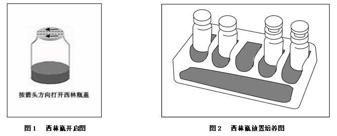 将疑是猪链球菌的新鲜菌苔置于已配备的无菌生理盐水中,与0.5 McFarland的浊度管比浊,将菌悬液制备成0.5McFarland ( 约108cfu/mL ),用吸管吸取2滴(约0.06mL)菌悬液加入每种微量生化管内。将已接种的西林瓶再套上胶塞,一般采用全加塞(如图2左两瓶所示),特殊情况在下表注明采用半加塞(如图2右两瓶所示),直立于内托的凹槽内(如图2),或放置于合适的瓶架中,于35-37℃培养箱中培养,结果观察见表1。