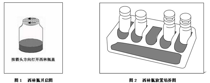 开启西林瓶前,用75%酒精棉消毒西林瓶表面,在无菌条件下,按铝盖上的箭头方向打开铝盖,撕开铝盖,打开西林瓶胶塞(如图1)。所有的西林瓶在使用后均高压灭菌后方可弃去。