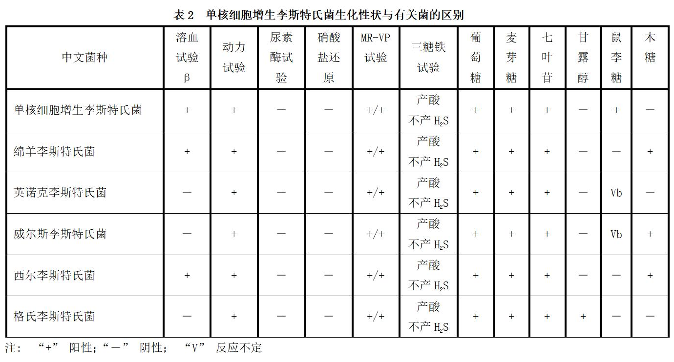四)单核细胞增生李斯特氏菌的主要生化特性及有关菌的区别见表2。(只供参考)