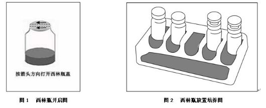 开启西林瓶前,用75%酒精棉消毒西林瓶表面,在无菌条件下,按铝盖上的箭头方向打开铝盖,撕开铝盖,打开西林瓶胶塞(如图1)。所有的西林瓶在使用后均高压灭菌后方可弃去。