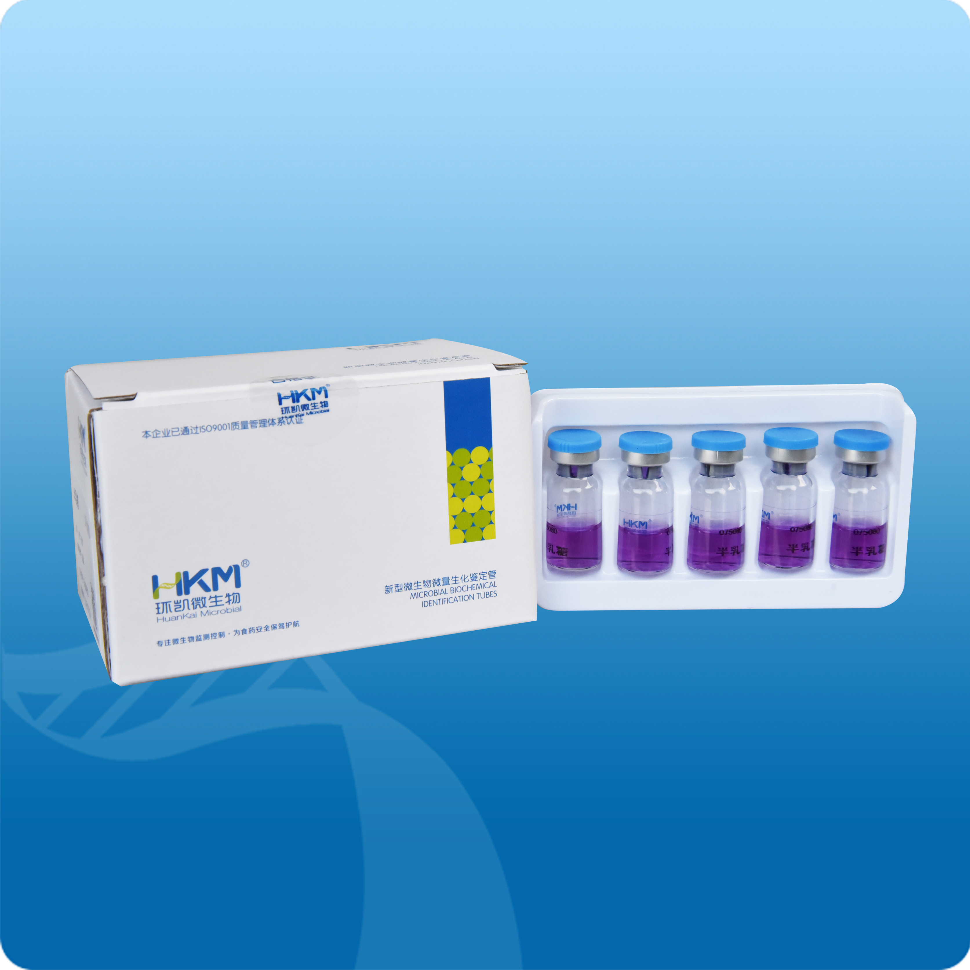 挑取待检菌落进行革兰氏染色镜检,将新鲜菌苔接种于普通肉汤中37℃培养18-24h或用0.85%无菌生理盐水稀释至0.5McFa-rland (约108cfu/mL), 各吸取0.05-0.08mL(约1~2滴)的肉汤培养物或菌悬液加入每种微量西林瓶内。将已接种的西林瓶再套上胶塞,一般采用全加塞(如图2左两瓶所示),特殊情况在下表注明采用半加塞(如图2右两瓶所示),直立于内托的凹槽内(如图2),或放置于合适的瓶架中,于35-37℃培养箱中培养,结果观察见下表1。注意:如有特殊的接种方式、培养时间或培养方式,请详见每种生化鉴定管附带的使用说明。