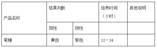 挑取待检菌落进行革兰氏染色镜检,将新鲜菌苔接种于普通肉汤中37℃培养18-24h或用0.85%无菌生理盐水稀释至0.5McFa-rland (约108cfu/mL), 各吸取0.05-0.08mL(约1~2滴)的肉汤培养物或菌悬液加入每种微量西林瓶内。将已接种的西林瓶再套上胶塞,一般采用全加塞(如图2左两瓶所示),特殊情况在下表注明采用半加塞(如图2右两瓶所示),直立于内托的凹槽内(如图2),或放置于合适的瓶架中,于35-37℃培养箱中培养,结果观察见下表1。注意:如有特殊的接种方式、培养时间或培养方式,请详见每种生化鉴定管附带的使用说明。