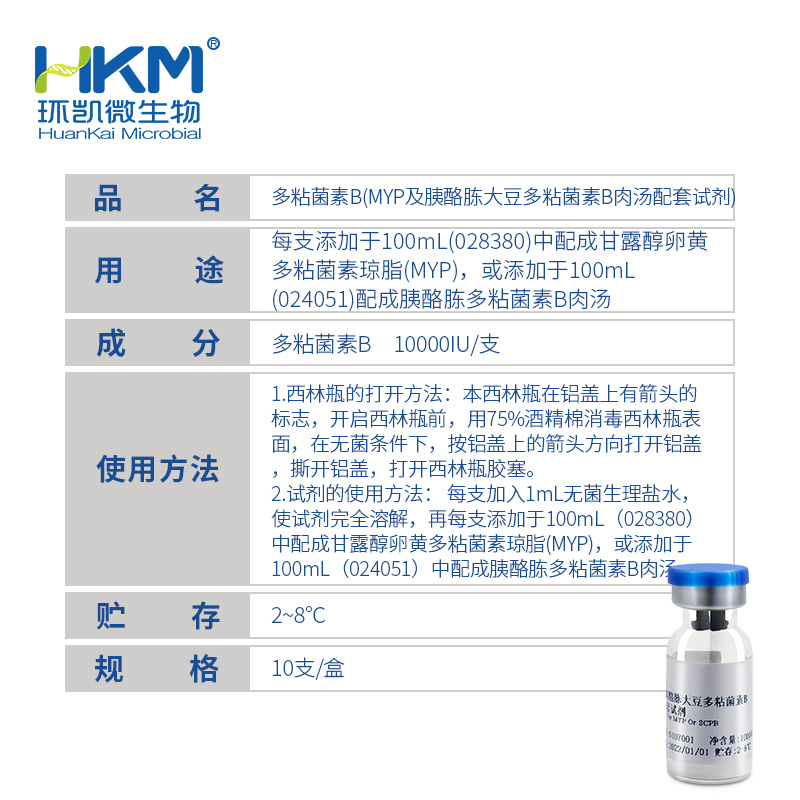 产品用途:每支添加于100mL(028380)中配成甘露醇卵黄多粘菌素琼脂,或添加于100mL(024051)配成胰酪胨多粘菌素B肉汤。