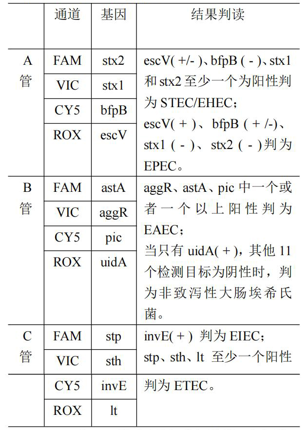 A 管体系可用于 STEC/EHEC、EPEC 检测,B 管体系可用于 EAEC 检测和大肠埃希氏菌种属鉴定,C 管体系可用于 ETEC、EIEC 检测。