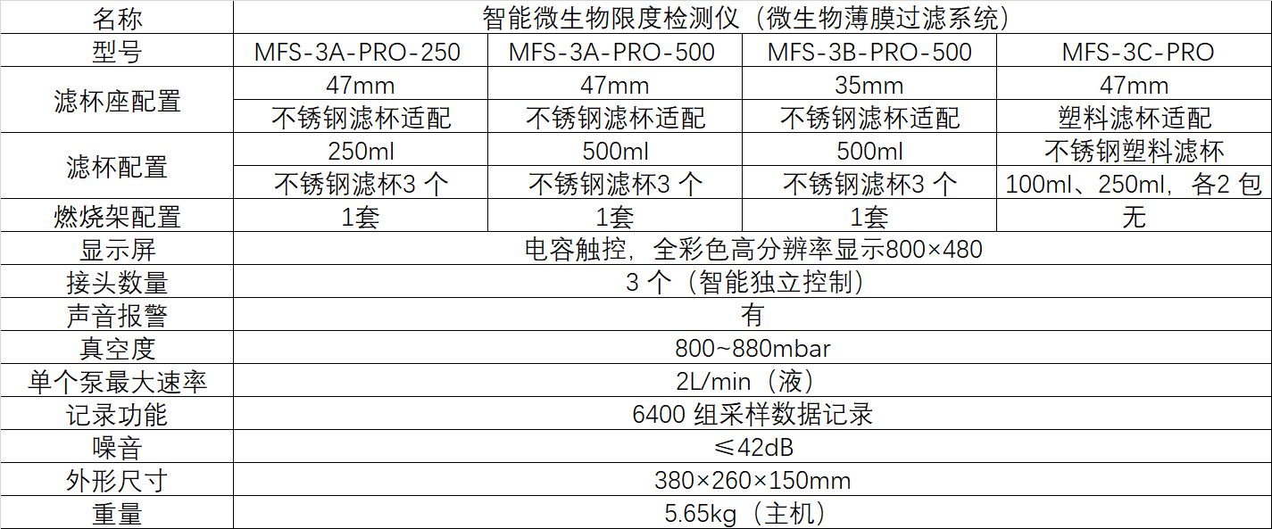 MFS-3-PRO系列智能微生物限度检测仪是专门为滤膜法微生物检测、悬浮固体物检测、样品纯化定制的—套过滤系统,适用于制药、化工、食品、化妆品与疾控等行业。