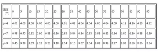 在电极进行校准时,最好等待缓冲液温度在标示温度下校准,这样测出的pH值才是缓冲液标示的值,比如pH 6.86和pH9.12的缓冲液是表示25℃下的pH值,那么你在20℃进行校准,显示的就不是6.86或者9.12。不过一般厂家都会附送一张缓冲液在不同温度下测的pH值,下图可以参考下。