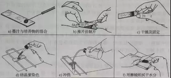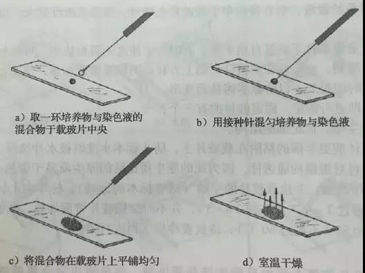 第二种方法是用一接种环苯胺黑与微生物混合,用接种针在载玻片的中央将混合物延伸很小的区域。具体操作如图所示: