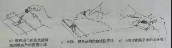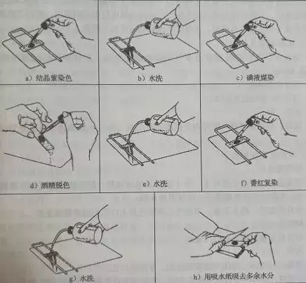 先按照上述的制片方法制片,制成需要观察的玻片后,使用相对应的染料滴加到玻片上的菌膜区域,以覆盖菌膜为准。按照不同染料的要求,结合所观察的内容确定染色时间,染色时间到达时,进行水洗,干燥等步骤。最后得到的玻片加盖盖玻片即可进行镜检。如有需要可以后续再进行油封、蜡封等封片过程。简单细菌染色过程如下图: