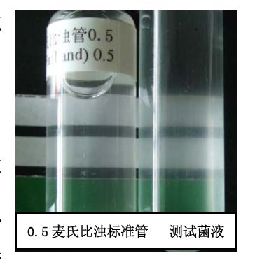 2. 以比色卡作为背景目测,直到浊度与0.5 麦氏比浊标准管的浊度相一致,如上图所示。