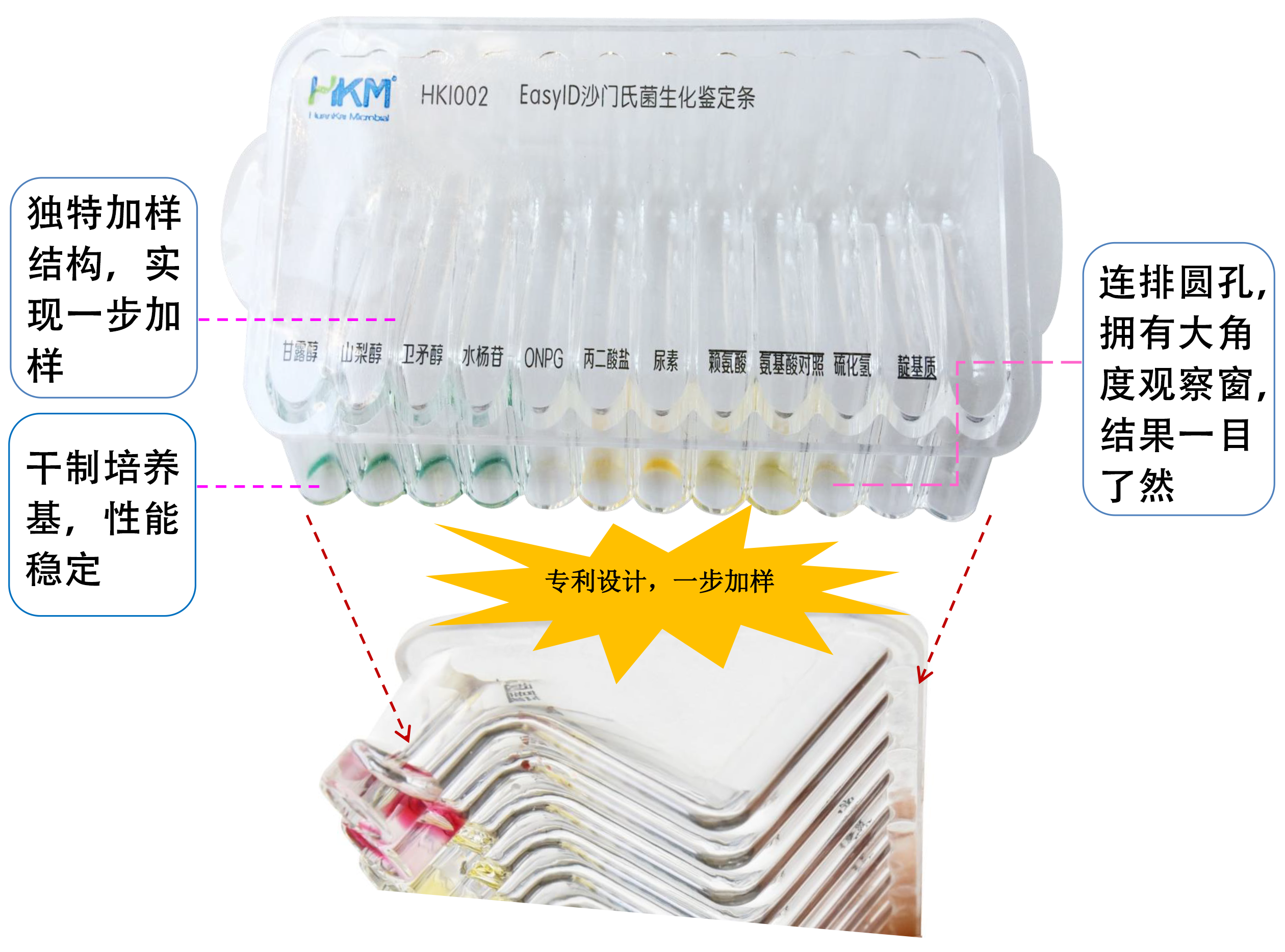 使用方法 :(以EasyID沙门氏菌生化鉴定条为例,详情请查阅相应产品说明书)