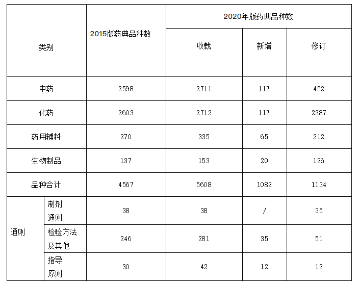 新版药典新增319种,修订3177种,不再收载10种,品种调整合并4种,共收载品种5911种。一部中药收载2711种,其中新增117种、修订452种。二部化学药收载2712种,其中新增117种、修订2387种。三部生物制品收载153种,其中新增20种、修订126种;新增生物制品通则2个、总论4个。四部收载通用技术要求361个,其中制剂通则38个(修订35个)、检测方法及其他通则281个(新增35个、修订51个)、指导原则42个(新增12个、修订12个);药用辅料收载335种,其中新增65种、修订212种(见表1)。