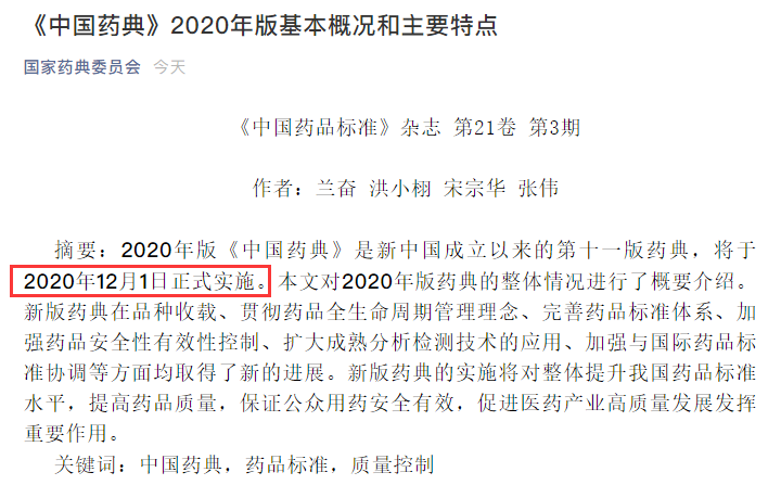 2020年版《中国药典》将于2020年12月1日正式实施