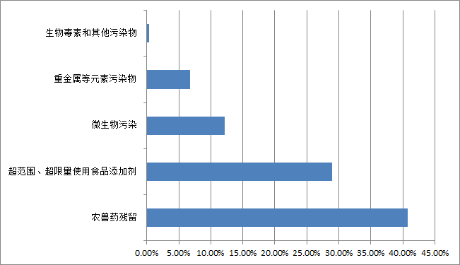 从不合格的项目类别看,主要是农兽药残留占不合格样品总数的40.71%,超范围、超限量使用食品添加剂占28.93%,质量指标占12.14%,微生物污染占11.43%,重金属等元素污染物占6.79%,生物毒素和其他污染物分别占0.36%。