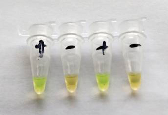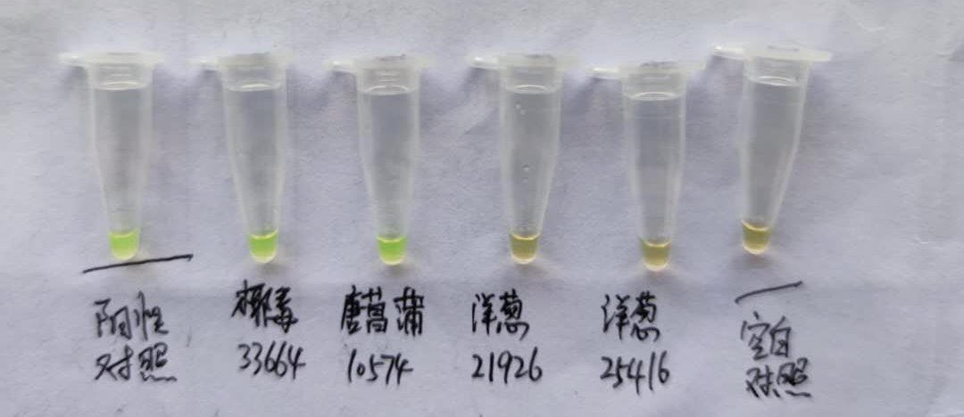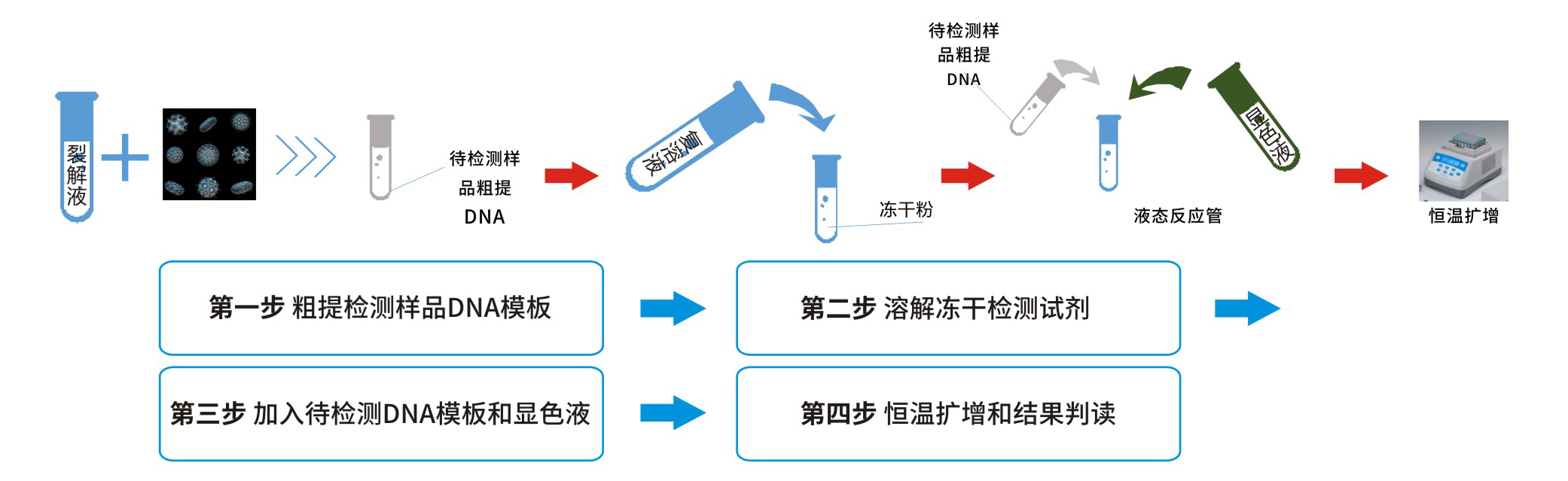 1. 技术原理:利用两对特殊引物和具有链置换活性的BstDNA聚合酶,使模板两端引物结合处循环出现环状单链结构,引物顺利与模板结合并进行链置换扩增反应,实现在恒温条件下(60~65℃)进行连续快速扩增。反应加入显色指示剂,阴阳性结果显色差异显著,可直接通过颜色变化判读结果。