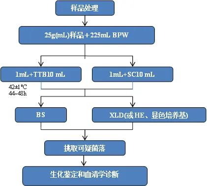2:预增菌时间与样品种类、目标菌和杂菌的含量及状态等因素有关。一般菌相比较复杂的高污染样品,如果增菌时间过长会导致杂菌生长过多,目标菌可能就会被另一种优势菌所取代,这种情况下,增菌时间不宜过长。低污染样品的增菌时间可以适当延长。由于本标准适用的样品种类众多,预增菌的时间范围设置的较宽(8h~18h),应根据实际情况和经验进行具体选择。建议BPW发生混浊时停止预增菌。