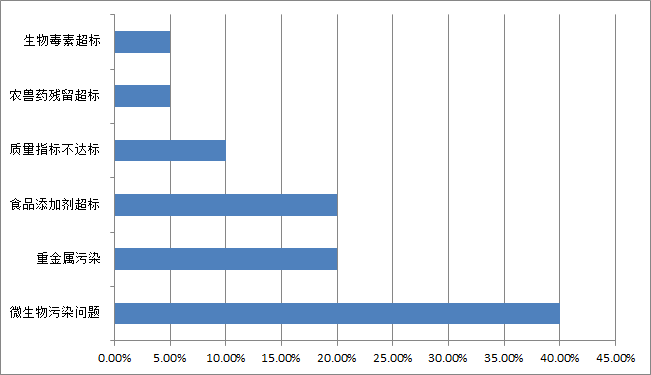 1月18日浙江省市场监督管理局网站发布食品安全监督抽检信息通告(2021年第2期),通告显示,浙江省市场监督管理局组织抽检粮食加工品、食用油、油脂及其制品、调味品、肉制品、乳制品、饮料、方便食品、饼干、冷冻饮品、速冻食品、薯类和膨化食品、糖果制品、茶叶及相关制品、酒类、蔬菜制品、水果制品、炒货食品及坚果制品、可可及焙烤咖啡产品、食糖、水产制品、淀粉及淀粉制品、糕点、豆制品、婴幼儿配方食品、餐饮食品、食盐、食用农产品等27类食品1140批次样品。根据食品安全国家标准检验和判定:抽样检验合格1120批次、不合格20批次,不合格项目涉及微生物污染、重金属污染、食品添加剂超标、质量指标不达标、农兽药残留超标、生物毒素超标等,其中微生物污染问题最突出,不合格项目占比如下: