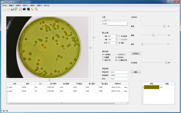 二.性能稍微好一些的,在一般性能的基础上,摄像头升级为高清摄像头,添加自动识别之后可以进行人工手动补充或删除部分错误计数的功能。这类的菌落计数器已经满足了大部分的检验机构使用了,但是对于一些要求精度比较高,菌落差别比较大,需要数据可溯源的机构,这样的基本功能是不够的。