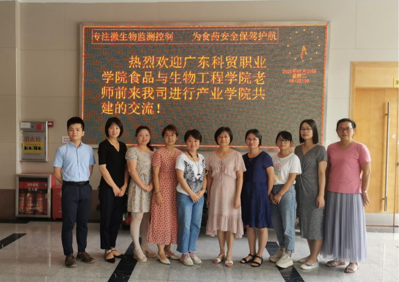 2021年7月20日,广东科贸职业学院食品与生物工程学院生物技术教研室姚莉主任一行6人莅临我司,环凯公司副总经理蔡芷荷携同公司技术和人力资源相关人员热情接待了他们,双方就学校与企业开展“现代产业学院建设”进行了深入交流。