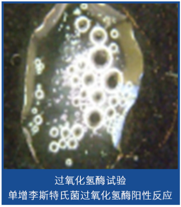 3)过氧化氢酶试验:李斯特氏菌过氧化氢酶阳性反应