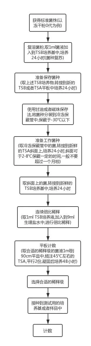 这里说的三个梯度不是说只是计数,而是菌悬液实际运用的测试中也需要三个梯度,举个例子,某个无菌产品无菌检查中的阳性对照测试,需要做三个对照。当然,同样的产品方法适用性,培养基促生长测试也是如此。流程图如下: