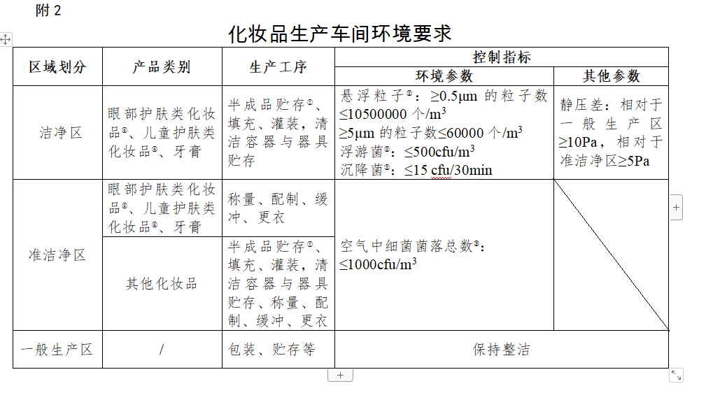 企业应当按照产品工艺环境要求,在生产车间内划分洁净区、准洁净区、一般生产区。同时明确了眼部护肤类化妆品、儿童护肤类化化妆品、牙膏品类的环境控制指标。
