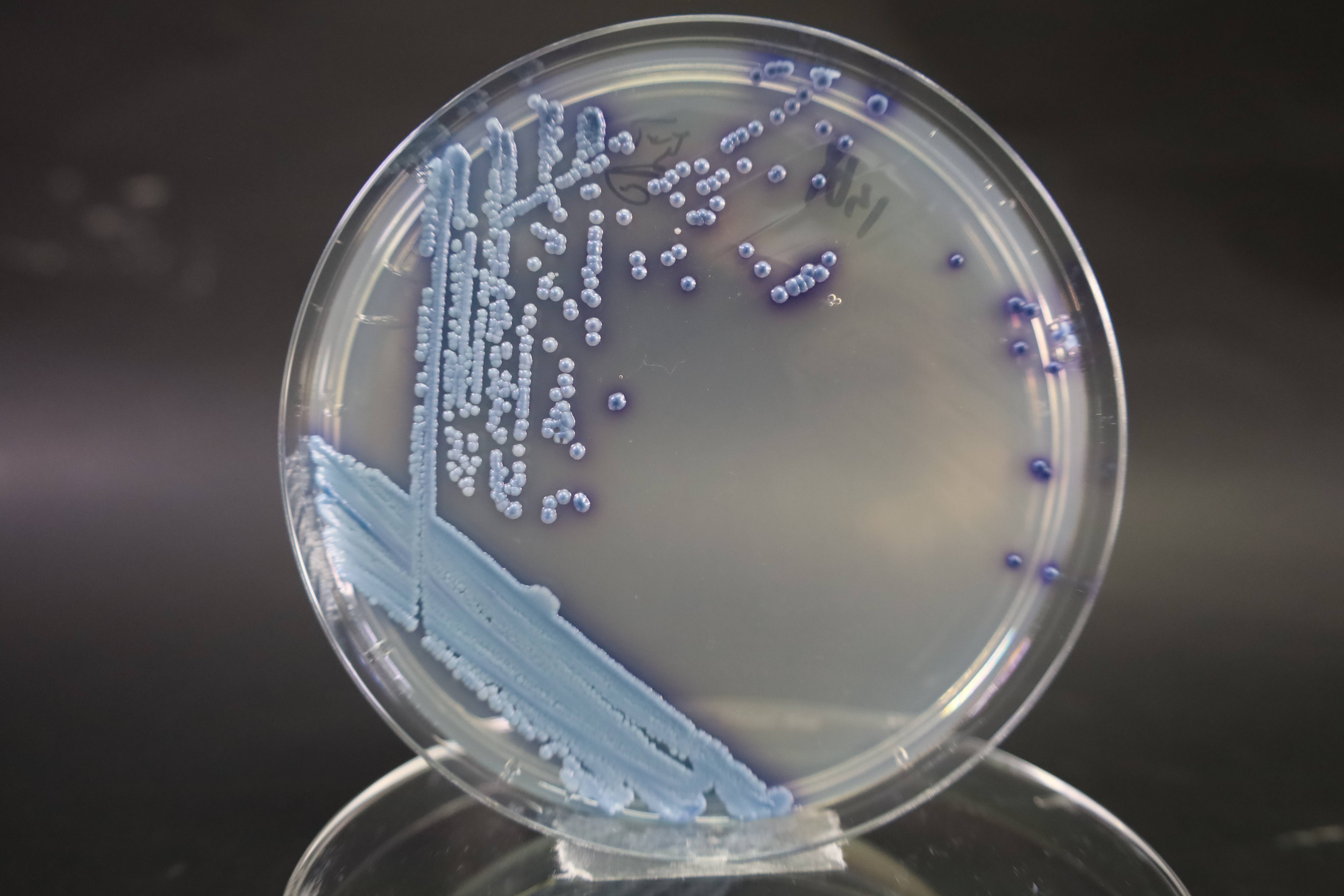 当大肠杆菌等肠道细菌生长时,发酵培养基中的乳糖,使加入的伊红-美蓝变色,在菌落上沉积为紫黑色,并呈现金属光泽。