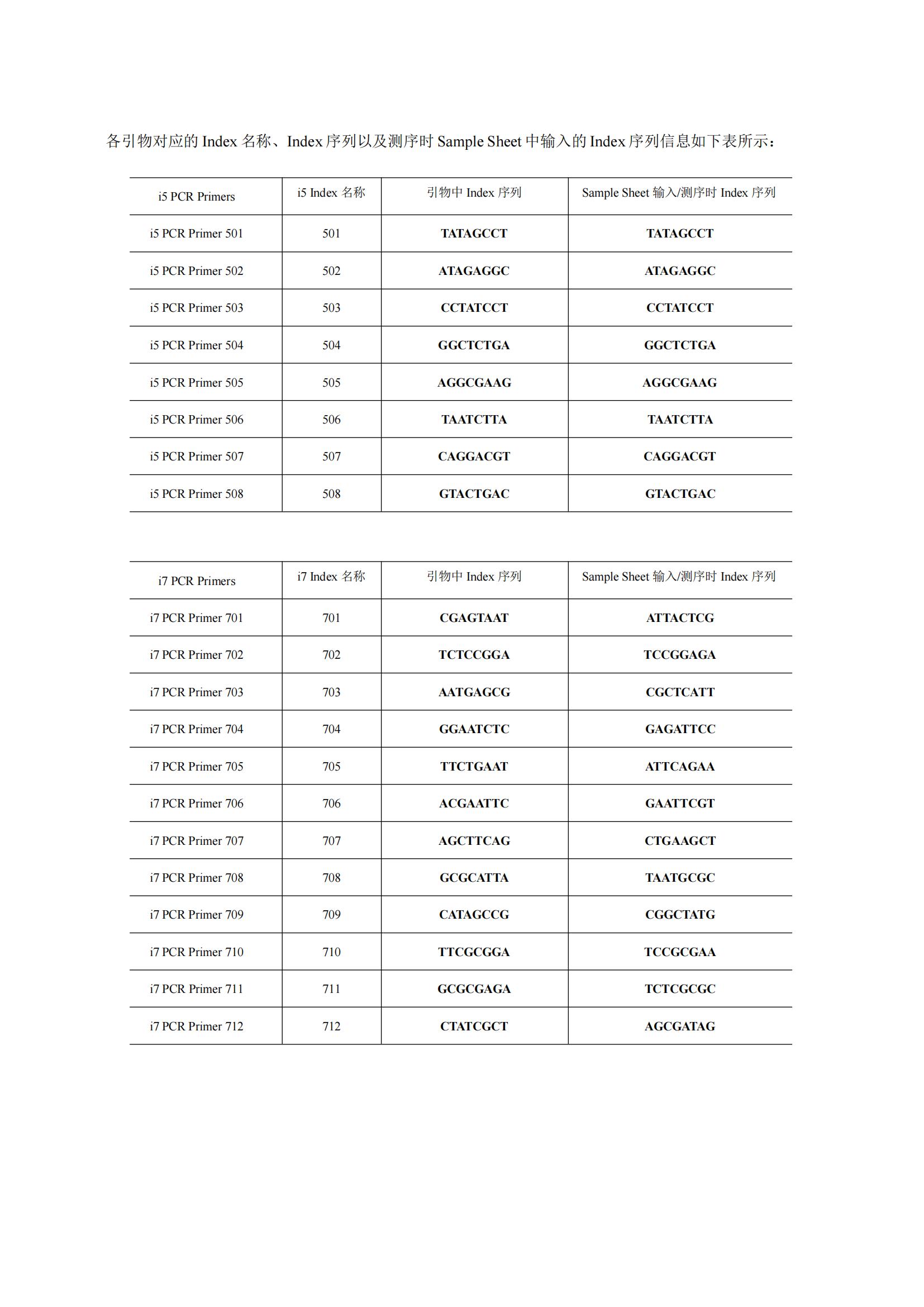 序列信息:Adapter for Illumina 5´-ACACTCTTTCCCTACACGACGCTCTTCCGATC-s-T-3´ 3´-CTGACCTCAAGTCTGCACACGAGAAGGCTAG-p-5´ (-s-表示硫代, -p 表示磷酸化) i5 PCR Primer 5´-AATGATACGGCGACCACCGAGATCTACAC[i5]ACACTCTTT CCCTACACGACGCTCTTCCGATC-s-T-3´ i7 PCR Primer 5´-CAAGCAGAAGACGGCATACGAGAT[i7]GTGACTGGAGTTC AGACGTGTGCTCTTCCGATC-s-T-3´ (-s-表示硫代) [i5]表示 8 bp i5 Index 序列,[i7]表示 8 bp i7 Index 序列。