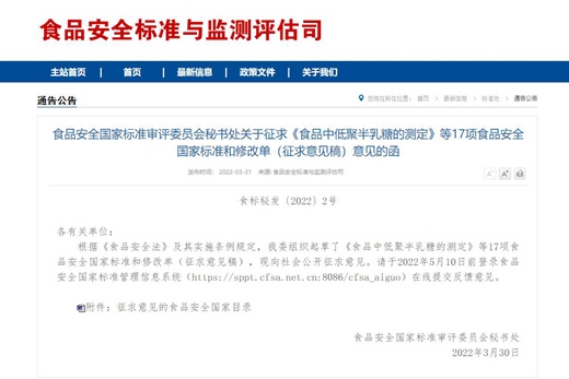 近日,食品安全国家标准审评委员会秘书处就《食品中低聚半乳糖的测定》等17项食品安全国家标准和修改单(征求意见稿)征求意见,意见反馈截止时间为5月10日前。