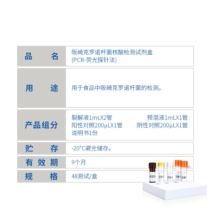 产品名称:阪崎克罗诺杆菌核酸检测试剂盒(PCR-荧光探针法)