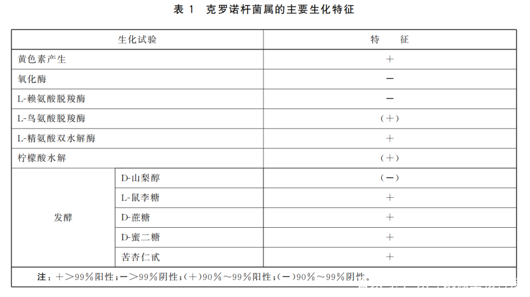 自TSA平板上直接挑取黄色可疑菌落,进行生化鉴定。克罗诺杆菌属的主要生化特征见表1。可选择生化鉴定试剂盒或全自动微生物生化鉴定系统。