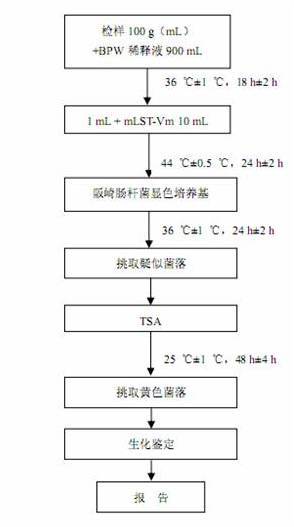 取检样100g(mL)加入已预热至44℃装有900mL缓冲蛋白胨水的锥形瓶中,用手缓缓地摇动至充分溶解,36℃±1℃培养18h±2h。移取1mL转种于10mL mLST-Vm肉汤,44℃±0.5℃培养24h±2h。