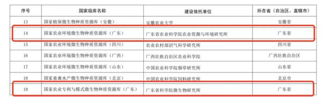 广东省科学院微生物研究所、广东省农业科学院农业资源与环境研究所两家单位农业微生物种质资源库入选。分别为:国家农业环境微生物种质资源库(广东)、国家农业专利与模式微生物种质资源库(广东)。