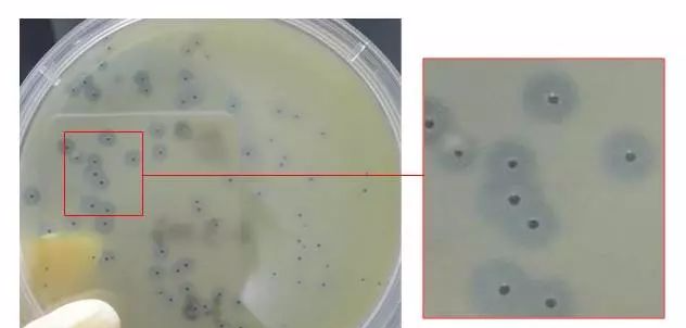 B-P琼脂上金黄色葡萄球菌有黑色的菌落中心,周围有半透明的卵磷脂沉淀环。金黄色葡萄球菌在B-P上的菌落特征如下图: