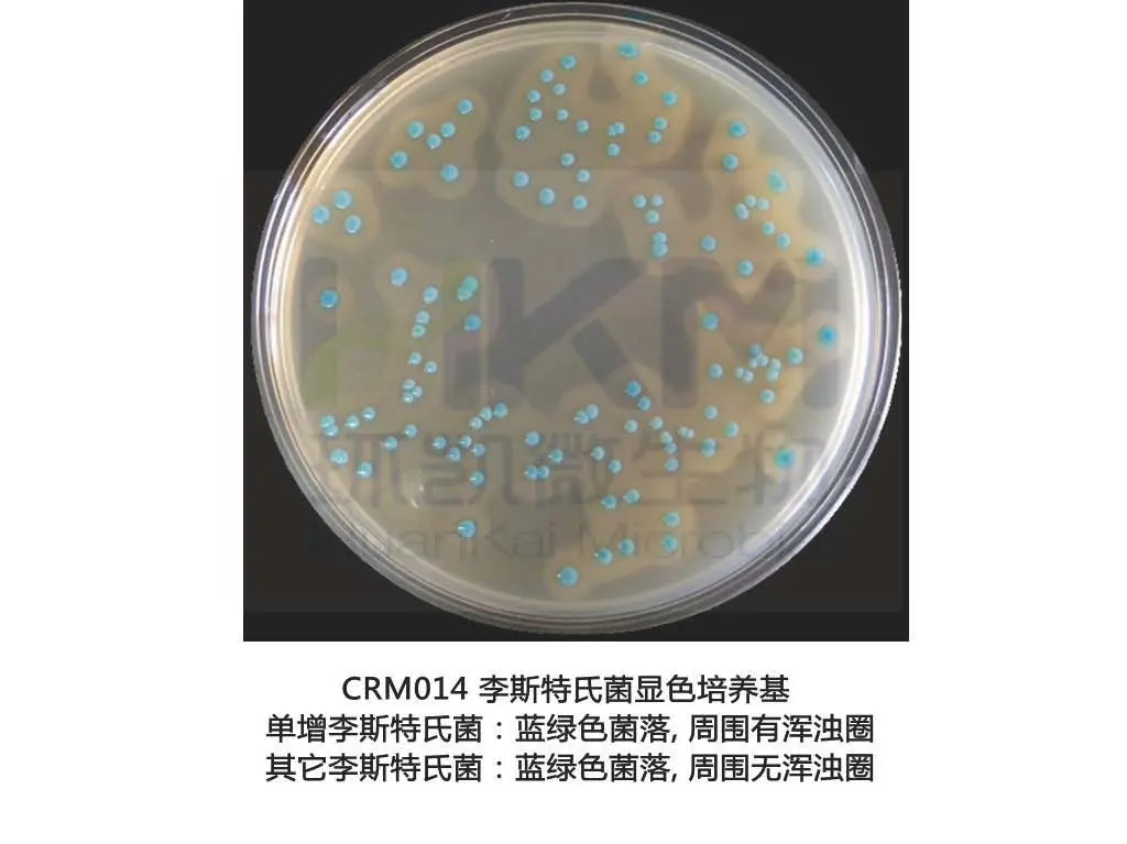 | PALCAM琼脂(李斯特氏菌传统分离培养基) 在此培养基上李斯特氏菌菌属的单增、英诺克、斯氏等均呈小的圆形灰绿色菌落,周围有棕黑色水解圈,无法区分。 | CRM013 单增李斯特氏菌显色培养基 在此培养基上单增/绵羊李斯特氏菌是蓝绿色菌落、英诺克/斯氏李斯特氏菌为无色菌落;属内不同种水平的菌落颜色对比清晰,易于区分。 |
