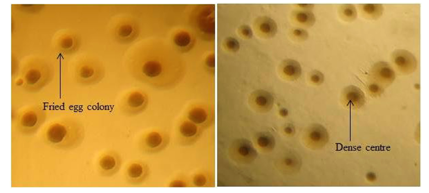 2~14天长出直径约10~600微米的“油煎蛋”样菌落,如下图: