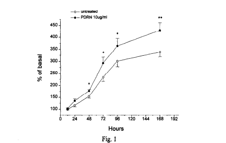 图1显示了人皮肤成纤维细胞增殖的时间过程,无论是在没有或存在 10 卩 g/ml PDRN 的情况下, 使用 MTT 试验进行评估。数值代表了 7 个不同实验的平均值,这些实验是使用从不同受试者获 得的成纤维细胞原代培养独立进行的。与未处理的对照组相比,PDRN 处理的细胞的生长速率显 著提高。这种效应在增殖 48 小时后已经显著,并持续了整个实验的持续时间。