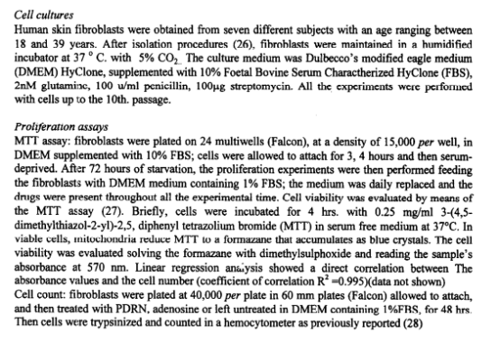 为了研究PDRN刺激成纤维细胞增殖的机制,我们评估了它在原代培养中对人类皮肤成纤维细胞生长的影响,以及嘌呤受体在这种现象中的参与:我们重点关注了A2A嘌呤受体的作用,作为这种亚型,被报道是最有可能的刺激细胞增殖的介质;